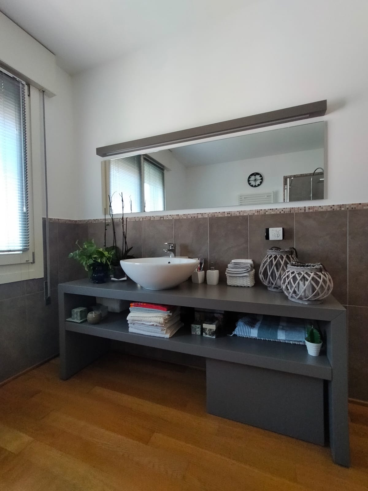 Per il mobile bagno si è scelto di usare l’MDF, poi laccato grigio scuro opaco, mentre la specchiera è stata realizzata con MDF laccato argento.