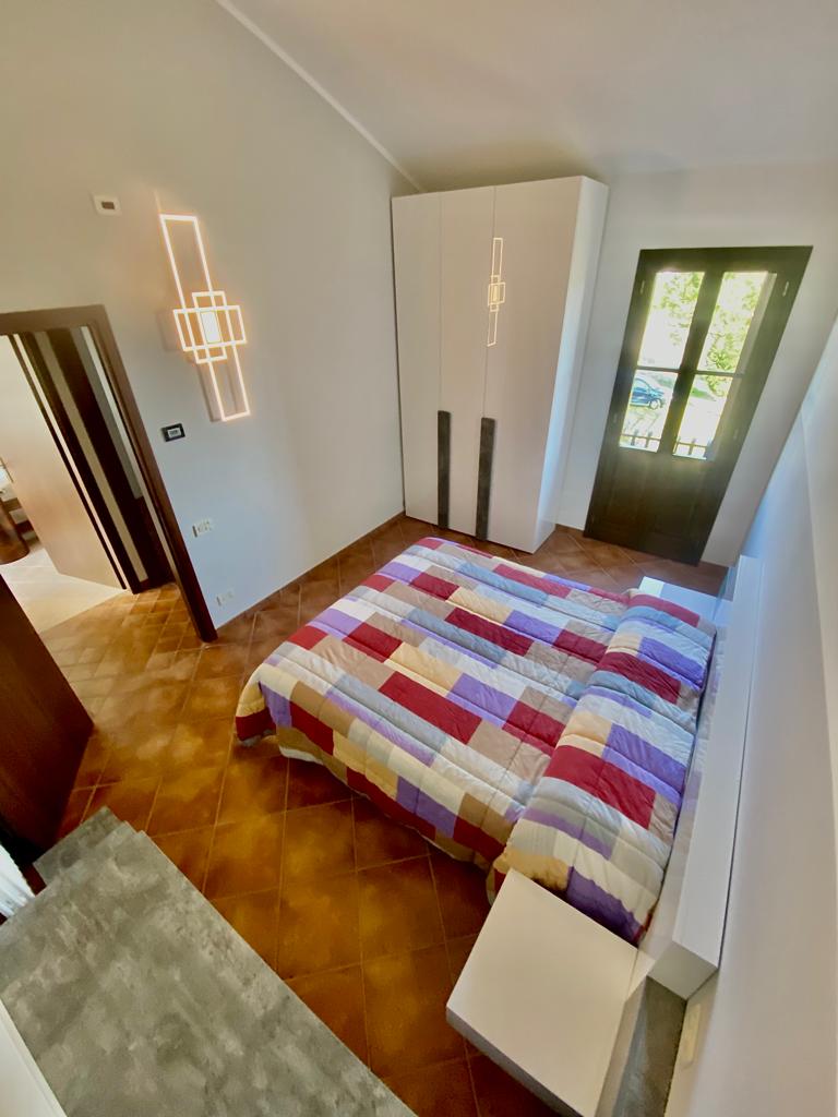 L’arredo della camera da letto (armadio / comodini sospesi / testiera e struttura letto / specchiera) è realizzato con MDF verniciato lucido W1100 PG Egger.
