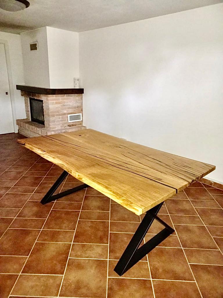 Completa l’arredo un bel tavolo in rovere massiccio stuccato nero scuro, oliato, spazzolato, con basamento in acciaio verniciato nero.