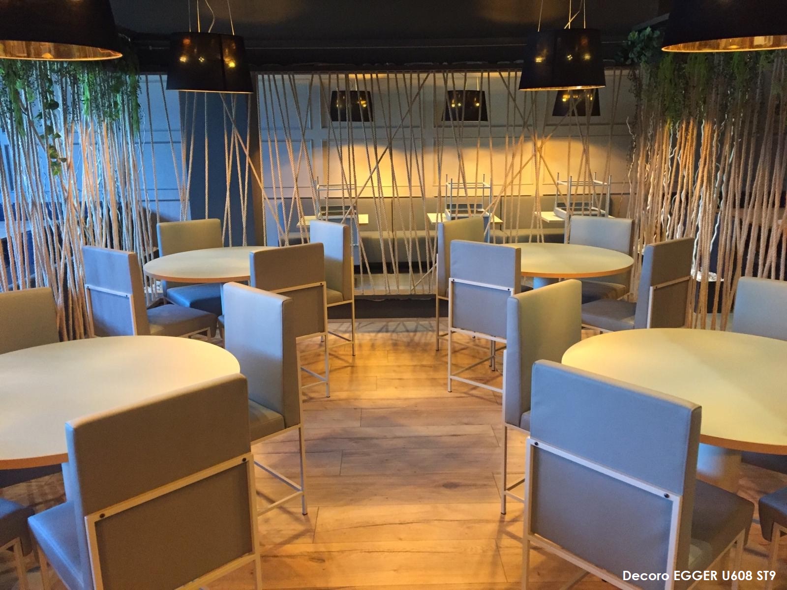Per i tavoli rotondi in “saletta” si è optato per il decoro Egger U608 ST9 Verde Pistacchio, che lavora in perfetto abbinamento con l’ Egger U636 ST9 Verde Fiordo utilizzato per creare gli abbassamenti delle pareti a corde.